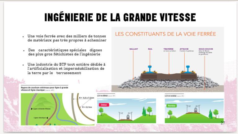 « Nombre d’arguments sensibles autrefois utilisés contre les premiers trains peuvent l’être aujourd’hui, à bien meilleur escient encore, contre le TGV. D’autant plus que son implantation ne comporte cette fois aucune contrepartie ; au contraire, elle contribue à un nouvel enclavement de régions entières, à la désertification de ce qu’il reste de campagne, à l’appauvrissement de la vie sociale. Et ce n’est pas dans la classe dominante, où tout le monde désormais travaille d’arrache-pied et joue des coudes pour rester dans la course économique, que l’on se risquera à juger tout cela à partir de goûts personnels, sans parler d’avancer quelque vérité historique que ce soit. Il faut donc qu’à l’autre pôle de la société des individus que ne presse aucun intérêt carriériste d’aucune sorte, pas même en tant que « contre-experts » ou opposants officiels, se chargent d’énoncer toutes les bonnes raisons, tant subjectives qu’objectives, de s’opposer à cette nouvelle accélération de la déraison. L’alliance qu’ils ont formée pour publier ce texte aura sans aucun doute d’autres occasions de se manifester et de s’étendre. »